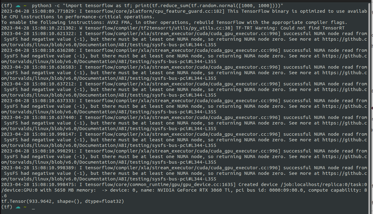 python3 -c "import tensorflow as tf; print(tf.reduce_sum(tf.random.normal([1000, 1000])))"